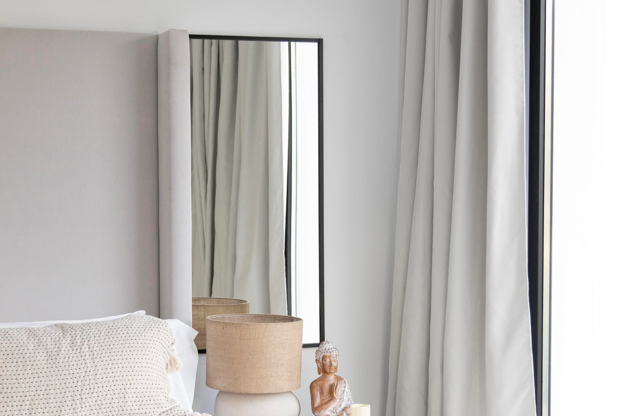 Escolha tecidos leves e agradáveis ao toque. Tons neutros e texturas naturais, como linho e algodão, criam um visual mais acolhedor.